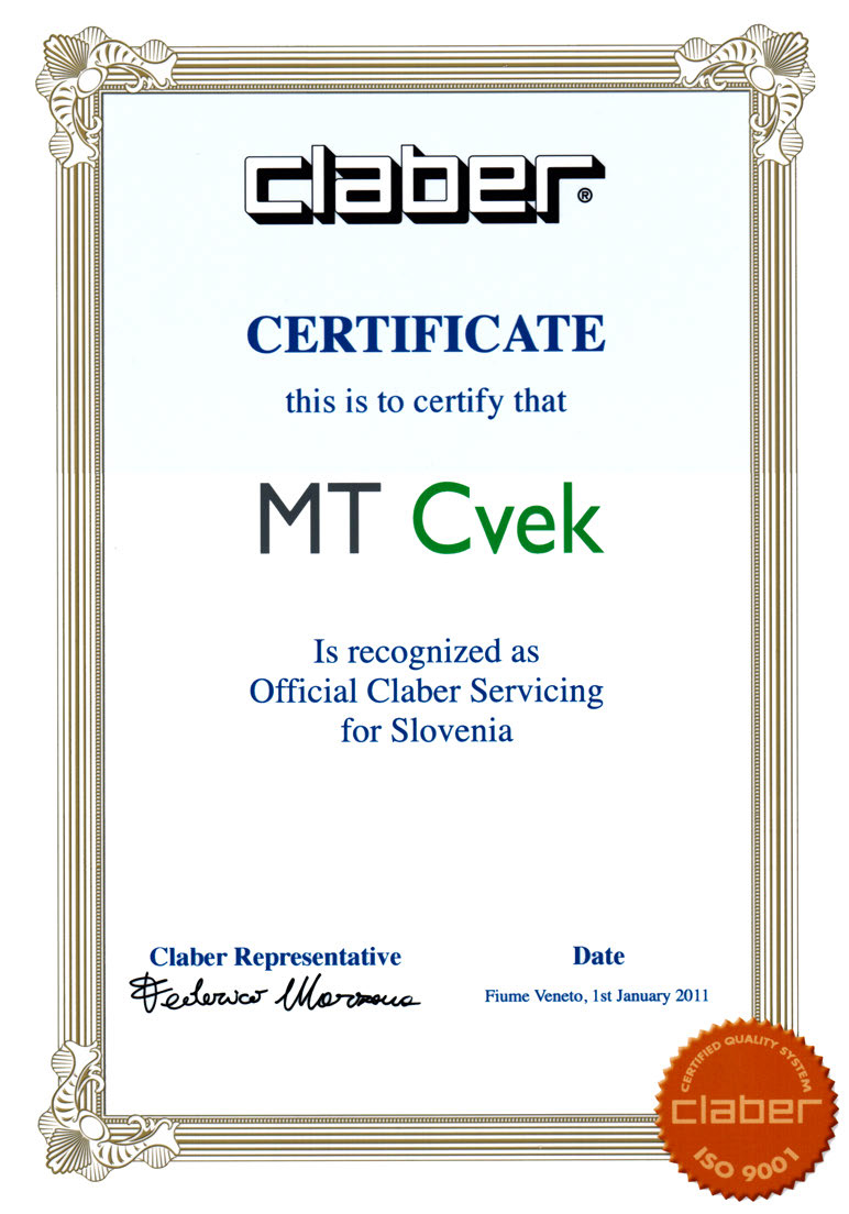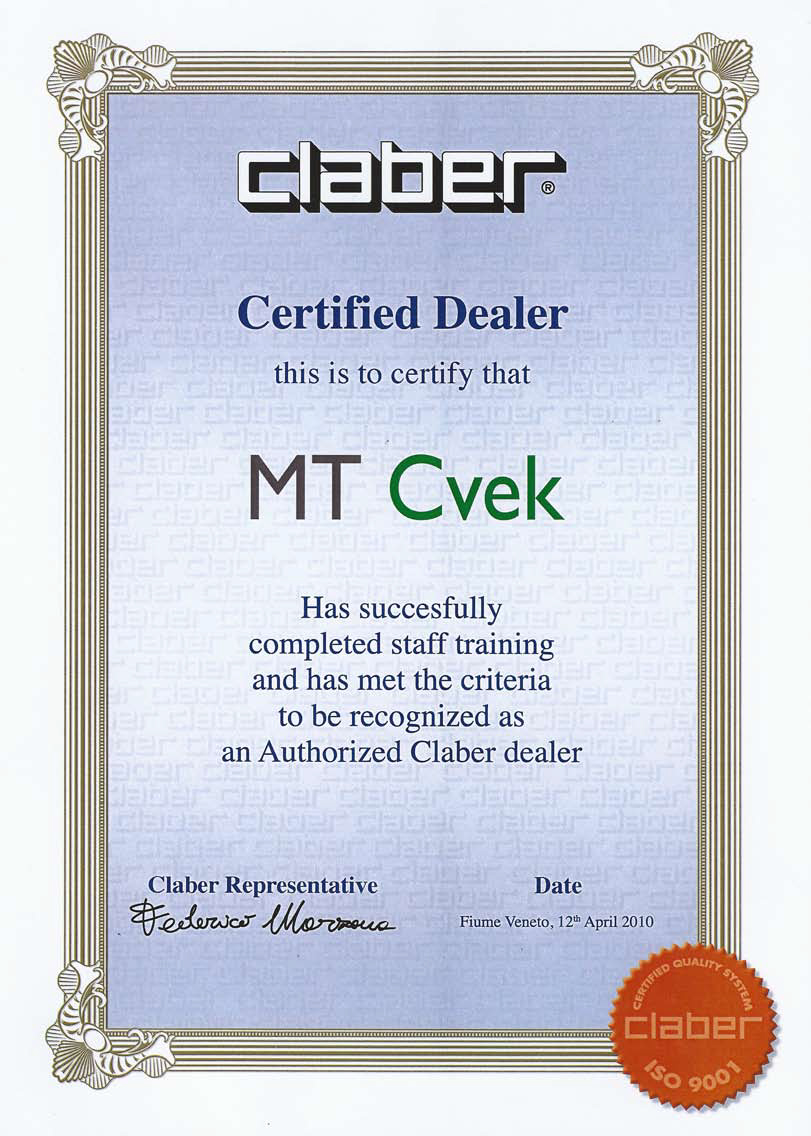 Pri MT Cvek d.o.o. vse od leta 2005 uspešno in učinkovito tržimo izdelke Claber® in tako upravičujemo zastopstvo za prodajo in namestitev namakalnih sistemov. Zaradi dolgoletnih izkušenj pri montaži namakalnih sistemov, smo se razvili v enega najboljših postavljalcev namakalnih sistemov Claber® v Sloveniji. Prav zato je podjetje Claber® našo uspešnost in zaupanje nadgradilo. Leta 2011 smo tako postali zastopnik za izdelke Claber® v Sloveniji.