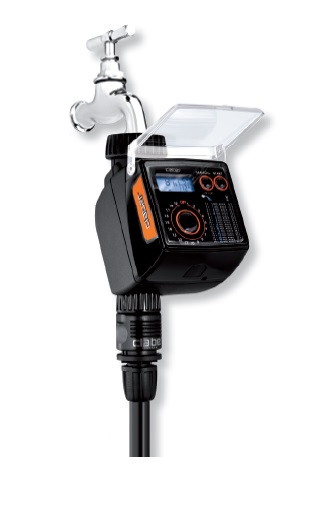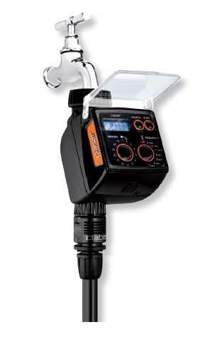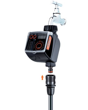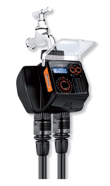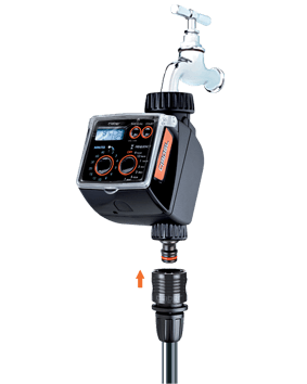 Ena krmilna ura s širokim izborom vnaprej določenih namakalnih časov, s katerimi izjemno preprosto upravljate dve neodvisni vodni liniji, saj uporabljate le nekaj gumbov. Električne povezave niso potrebne: ena 9V beterija zadostuje za celo sezono. Krmilno uro samo privijete na pipo in je že pripravljena za uporabo. Izbirate lahko med 14 namakalnimi časi in 7 frekvencami, kar predstavlja skupno 98 programov za vsako linijo. Osvetljeni LCD zaslon in funkcija zakasnitve izbranega programa. Preizkušena za zanesljivo in brezskrbno delovanje.Že opremljena za enostavno povezavo s senzorjem za dež prek kabla; senzor v primeru dežja prekine program v teku in ga znova zažene, ko dež poneha.