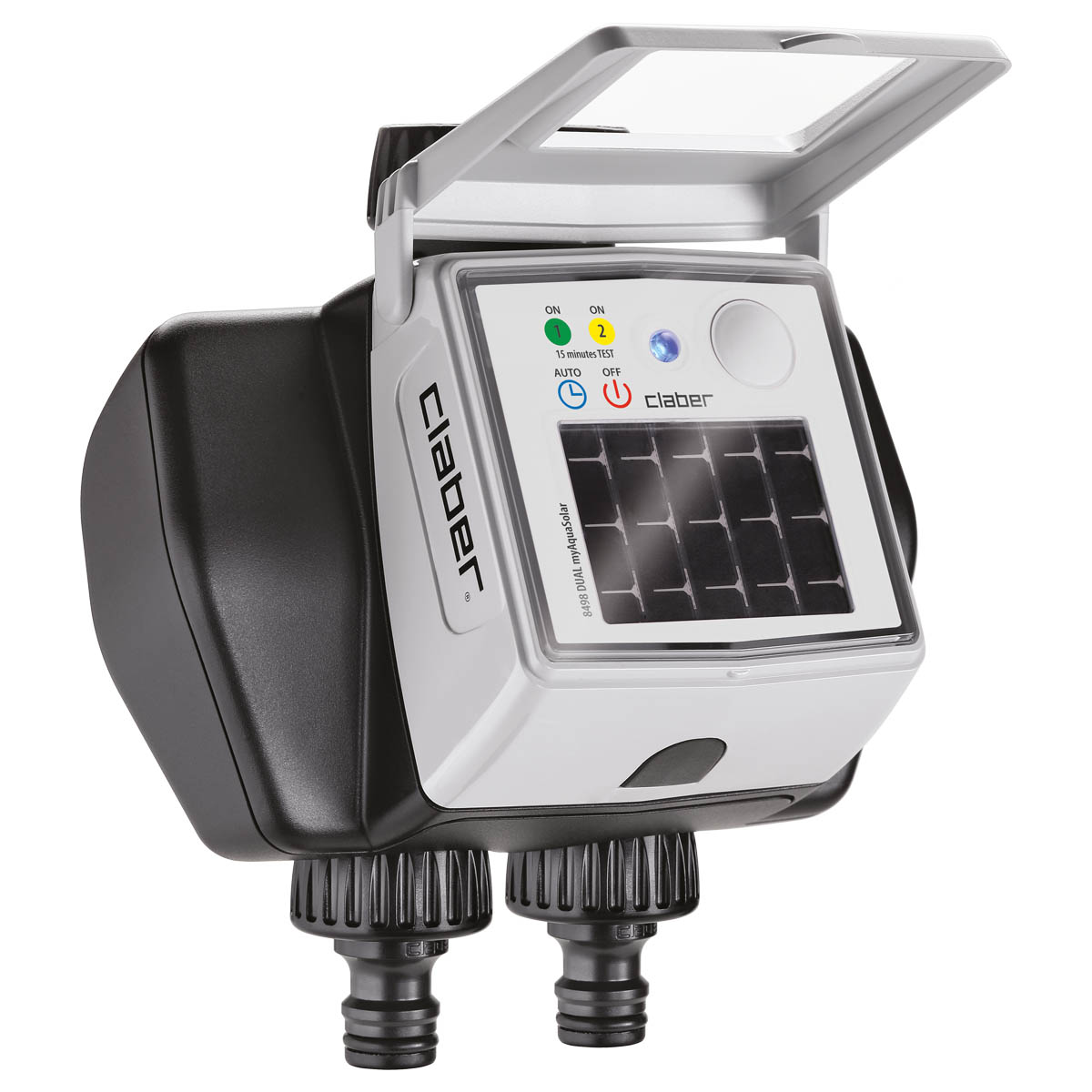Avtomatska krmilna ura z 2 vodnima linijama. Opremljena je z vgrajeno fotovoltaično ploščo in se tako napaja zgolj s sončno energijo, tudi če sama plošča ni neposredno izpostavljena sončni svetlobi. Baterije niso potrebne. Enostavno programiranje s tehnologijo Bluetooth® in aplikacijo Claber myAquaSolar. 2 popolnoma prilagodljiva programa na posamezno linijo. Na sprednji strani se nahajata gumb za izklop krmilne ure in gumb zagon ročne funkcije (15 min), ki jo lahko aktivirate tudi iz aplikacije. Programirate lahko tudi tedenske cikle zalivanja z izjemo dni, ki jih želite izpustiti. Vse elektronske komponente so popolnoma izolirane. 3/4" (20-27 mm) priključek za pipo. Enota je opremljena s pralnim filtrom iz nerjavečega jekla. Delovni tlak: od 0,5 do 10 barov. Krmilna ura omogoča neposredno povezavo s senzorjem za dež (koda 90915).Kvaliteta "myAquaSolar" je stalno nadzorovana in testirana.