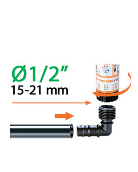 Popolna kakovostna rešitev iz najbolj celovite ponudbe pripomočkov za namakanje na trgu. Za namakalne sisteme, ki jih domači mojstri in vrtnarski navdušenci ustvarjajo sami. Omogoča združevanje dveh koncev glavne cevi pod kotom 90°, da lahko, na primer, sledite obodu terase ali gredice.