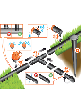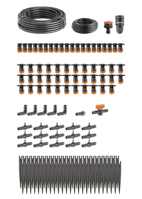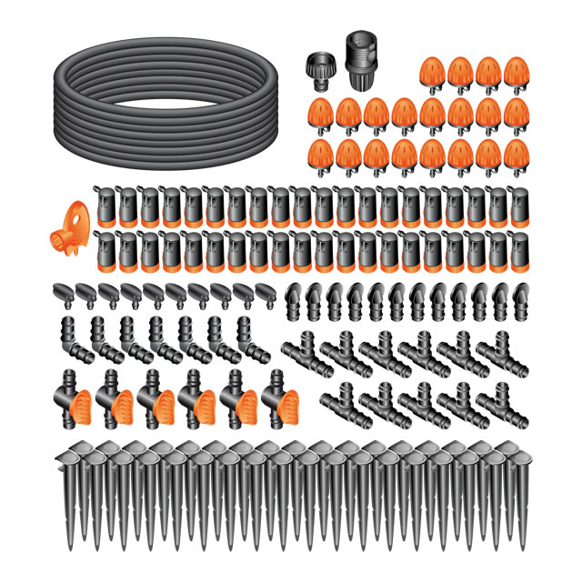 Takojšnja in celovita rešitev za postavitev namakalnega sistema za kapljično namakanje rastlin v vašem zelenjavnem vrtu. Vključuje vse kar potrebujete: glavno cev, razvodno cev, nastavljive kapljalnike in dodatke. Količino vode je mogoče nastaviti za vsako posamezno rastlino in jo lahko prilagodite glede na podnebje, zemljo in potrebe posamezne rastline ter na ta način dosežete najboljše rezultate in dobro počutje vaših rastlin. Poleg tega prihranite tudi dragoceno vodo, saj zalivate blizu korenin in ob najbolj primernem času. Sistem lahko priključite na baterijsko krmilno uro, lahko pa ga tudi razširite z dokupom izdelkov iz linije "RainJet®".