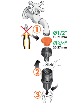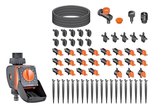 Baterijska krmilna ura s prednastavljimi programi, priključek za pipo, prožna cev, spojke. zmanjševalec pritiska, nastavljivi kapljalniki: vse kar potrebujete za enostavno ustvarjanje lastnega kapljičnega sistema za lončnice, ne da bi za to potrebovali orodje. Količino vode, ki se dovaja k posamezni rastlini, lahko nastavljate. Z obračanjem izbirnika na krmilni uri izbirate med 15 različnimi programi. Idealen set za "naredi si sam" projekte ali kot darilo.