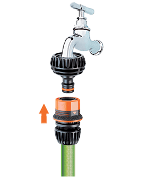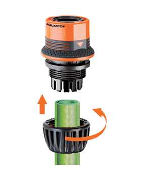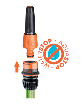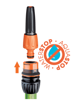 Ena spojka za vse cevi z najpogostejšimi premeri: z gumo prevlečena površina z dvignjenimi izboklinami zagotavlja popoln oprijem tudi z mokrimi rokami, hkrati pa spojko varuje pred morebitnimi udarci. Patentirana notranja vzmet je izjemno odporna in vodotesna, saj je, namesto iz kovine, izdelana iz zelo trdnega plastičnega materiala. Z avtomatskim ventilom aquastop za zaustavljanje vode, ki omogoča spojitev in odstranitev priključkov s konca cevi, ne da bi za to morali zapreti vodo.