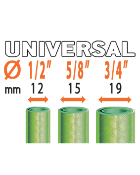 Za popravilo poškodovane vrtne cevi ali za povezavo dveh koncev cevi, tudi če so le-te različnih premerov. Za 1/2" (not. Ø 12 mm - zun. Ø 17 mm), 5/8" (not. Ø 14 mm - zun. Ø 19 mm) in 3/4" (not. Ø 19 mm - zun. Ø 25 mm) cevi.