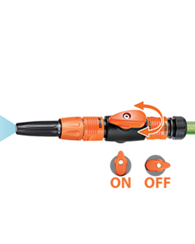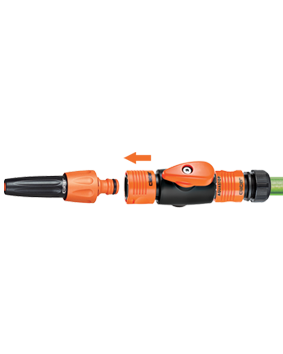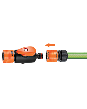 Hitra spojka z zapornim ventilom za reguliranje pretoka vode. Enostavno upravljanje. "Quick-Click®" spajanje s hitro spojko. Popolnoma vodotesno.