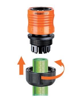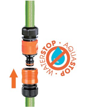Hitra spojka za 3/4" vrtne cevi (not. Ø 19 mm - zun. Ø 25 mm) z ventilom aquastop. Namesti se na koncu cevi, da prepreči izlivanje vode po končani uporabi.