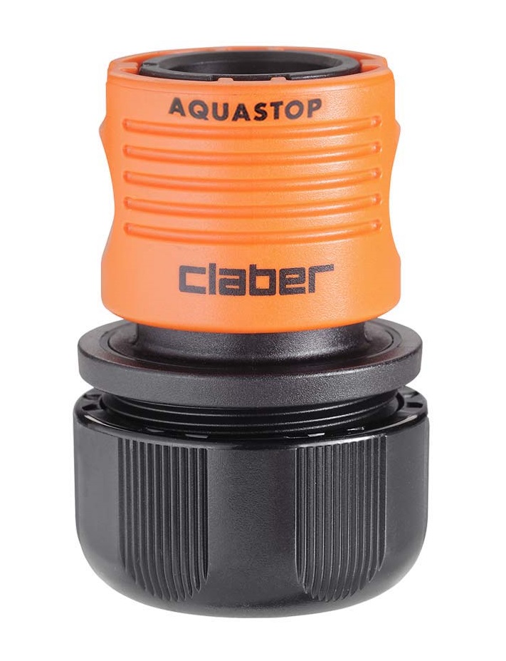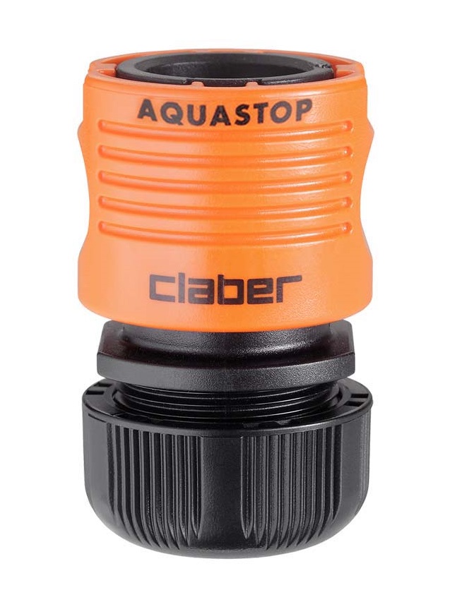 Hitra spojka z avtomatskim zaustavljanjem vode (sistem Aquastop) omogoča spojitev in odstranitev priključkov s konca cevi, ne da bi za to morali zapreti vodo. Izdelek je rezultat Claber® raziskav in izkušenj. Spojka je popolnoma nerjaveča (ne vsebuje kovinskih delov), odporna na udarce, zunanje vplive in UV žarke ter odporna na zelo visoke vodne pritiske: do 40 barov, kar je precej večji pritisk, kot je v običajnih domačih vrtnih napeljavah. Notranja vzmet je patentirana, izjemno odporna in z dolgo življenjsko dobo.
