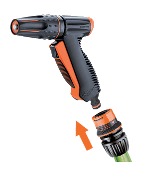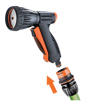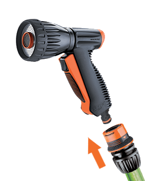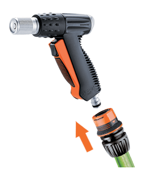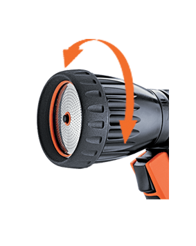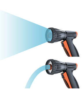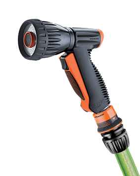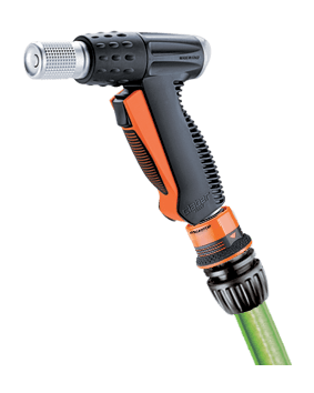 Večnamenska razpršilna pištola z novim anatomsko oblikovanim gumijastim ročajem in priročnim gumbom za vklop/izklop na sprednji strani. Gumb na zadnji strani uravnava moč vodnega curka. Naprava za uporabo načina pršenja je prevlečena z gumo za zaščito pred udarci, poleg tega pa omogoča lažje odpiranje, pregled in čiščenje pištole. Z vrtenjem glave razpršilne pištole lahko izbirate med štirimi različnimi tipi pršenja: tuš, koncentriran curek, nežno škropljenje ali učinek megle.