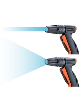 Preprosto zavrtite mehko, z gumo prevlečeno, glavo pištole in že izbirate med 4 vrstami vodnega curka. Tudi ročaj je prevlečen z gumo za popoln oprijem v vseh pogojih. Sprednji del ročaja je gumb, ki omogoča odpiranje ali zapiranje vode z uporabo le enega prsta. Tudi pretok vode lahko nastavite z le eno roko.