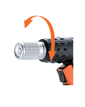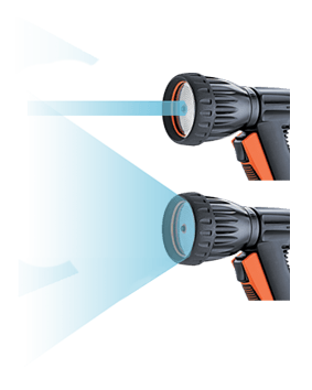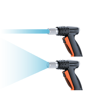 Razpršilna pištola z novim anatomsko oblikovanim gumijastim ročajem in priročnim gumbom za vklop/izklop sprednji strani. Gumb na zadnji strani prilagaja moč vodnega curka. Glava pištole je obložena z gumo, ki jo ščiti pred udarci. Pretok vode se lahko prilagaja zahtevam, od popolnoma zaprtega (koncentriran curek) do popolnoma odprtega (pršenje).