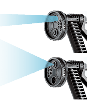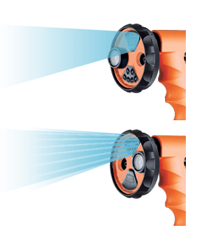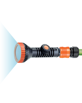 Večnamenska razpršilna pištola omogoča zalivanje vrta z razširjeno izbiro vodnih curkov: od zgoščenega curka do nežnega pršenja - ekonomično, nežna meglica, učinek rahlega dežja ali učinek plohe. Z ročico za prilagoditev vodnega curka in patentiranim zatičem za uporabo izbranega načina pršenja. Moč pritiska uravnavate ročno.