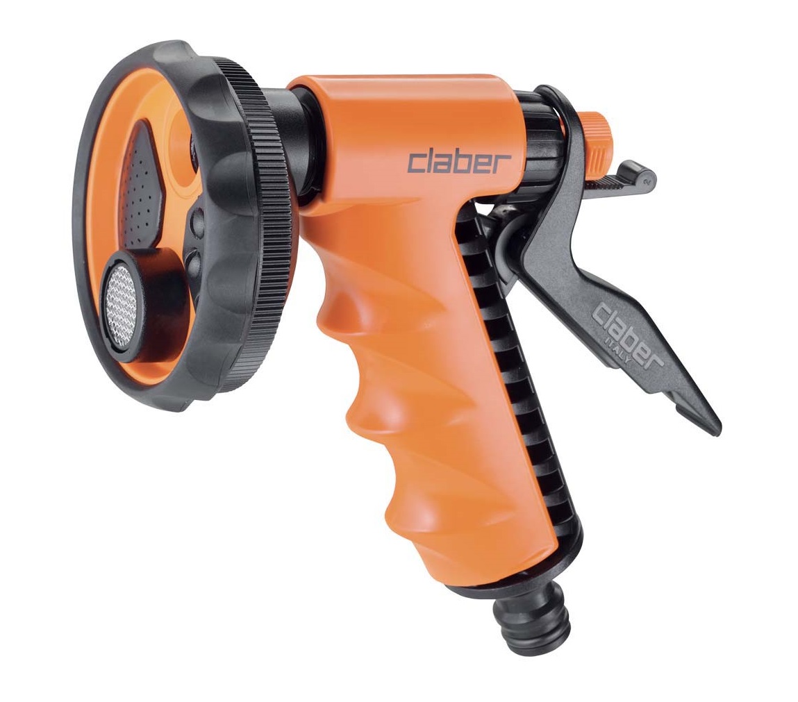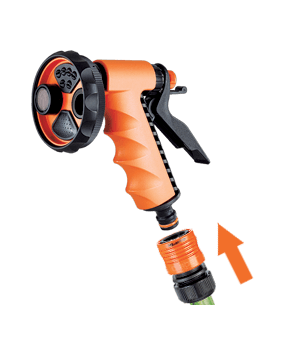 Večnamenska razpršilna pištola s praktičnim ergonomsko oblikovanim ročajem. Obračanje glave pištole omogoča različne načine pršenja: od jeta do nežnega pršenja - nežna ploha - učinek rahlega dežja - škropljenje (curek zmešan z zračnimi mehurčki). Zelo uporabno za zalivanje lončnic. Z ročico za prilagoditev vodnega curka in patentiranim zatičem za uporabo izbranega načina pršenja.