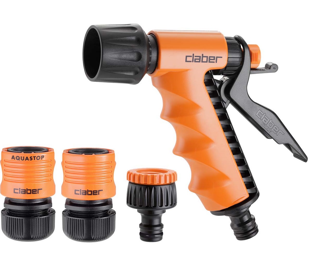 Vse kar potrebujete za učinkovito in udobno zalivanje: edino kar manjka je cev! Vsebuje razpršilno pištolo z ergonomskim ročajem - kompaktna, trdna, enostavna in udobna za uporabo - in mehanizmom s katerim nastavljate vodni curek in zataknete izbrani način zalivanja, kar je zelo koristno, da preprečite utrujenost rok ob daljši uporabi, 3/4" priključek za pipo reducirko na 1/2", ki ga namestite brez uporabe orodja, dve hitri spojki za "Quick-Click®" spajanje, pri čemer je ena klasična, druga pa z ventilom Aquastop, ki vam omogoča hitro povezavo ali odstranitev razpršilca, ne da bi za to morali zapreti vodo.