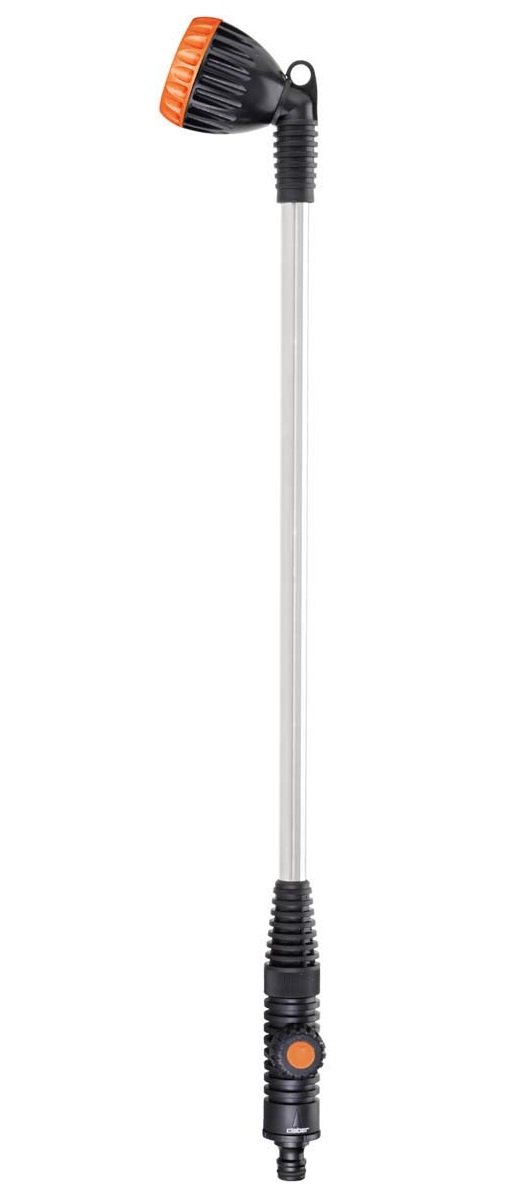 Fino, mehko in nežno pršenje. Nedrseč ročaj z ventilom za reguliranje vodnega toka. Perforiran disk iz nerjavečega jekla. Z dolgim aluminijastim podaljškom.