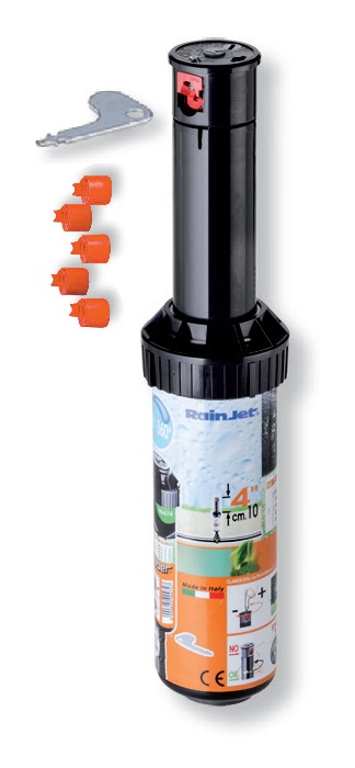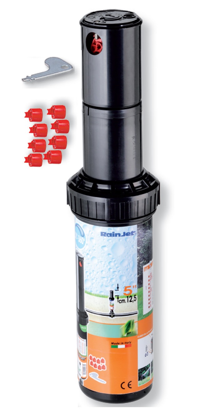 Turbinski razpršilec s hitrim izbiranjem med 4 vgrajenimi šobami z različnimi pretoki in dometi, ki zagotavljajo enotno in uravnoteženo distribucijo vode. Delovni kot se lahko nastavi od 40° do 360°. Prilagoditveni vijak na zgornjem delu omogoča izbiranje šobe, nastavljanje delovnega kota in prilagajanje pretoka. Posebne šobe zagotavljajo visoko učinkovitost in kar največje prihranke vode. Odlična zmogljivost tudi pri nizkem tlaku. Notranji filter se lahko odstrani in po potrebi očisti pod tekočo vodo. Višina od tal je 5" (12,5 cm). 3/4" ženski priključek omogoča montažo na že obstoječe namakalne sisteme. Priložen je tudi poseben ključ za nastavljanje. Priporočeni delovni tlak med 2 in 5 barov (25-75 PSI). Radij (domet) med 9,8 in 11,0 metrov.